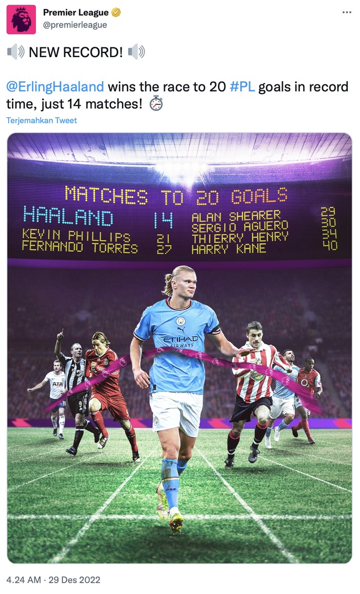 Ngerinya, Haaland jadi pemain tercepat yang cetak 20 gol di Liga Inggris. Luar biasa! Foto: Twitter