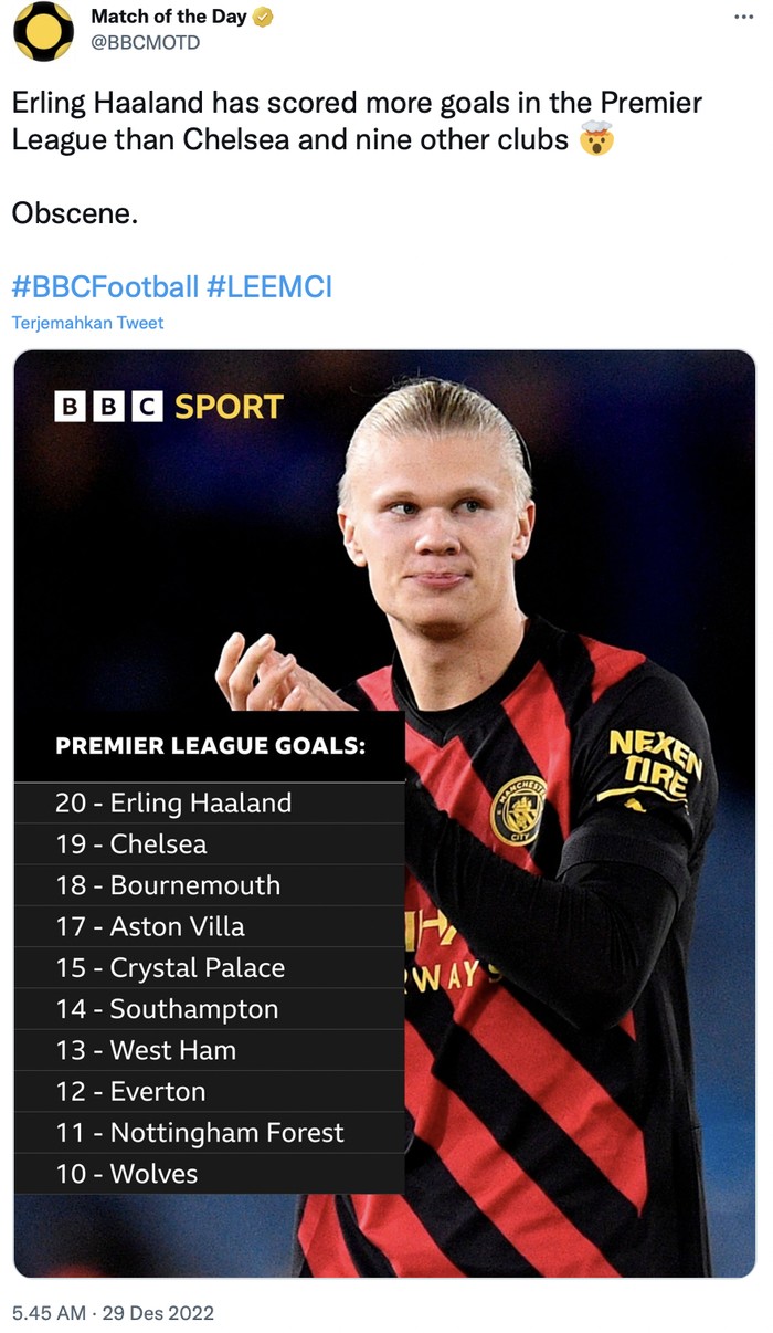 Tak hanya itu, klub Lig Inggris lainnya pun kalah tokcer dengan gol pria asal Norwegia ini. Foto: Twitter