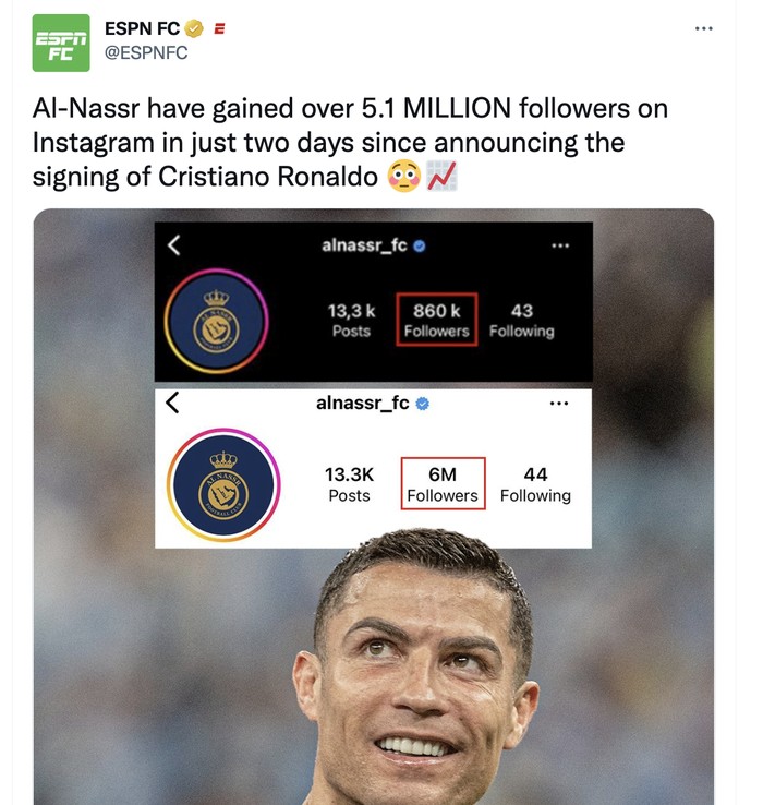 Berkat mendatangkan Ronaldo, Al Nassr ketiban berkah, yaitu follower Instagram mereka meningkat drastis. Foto: Twitter