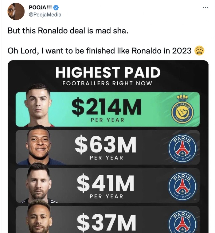 Meme sindiran bahwa Ronaldo datang ke Arab Saudi karena uang, padahal dia dinilai sudah kaya raya. Foto: Twitter