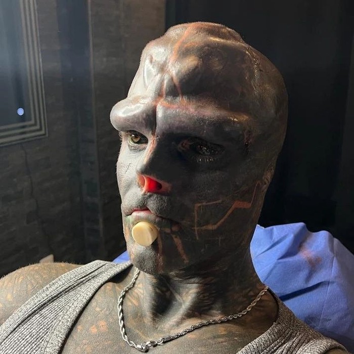 Selain itu, lidahnya juga dibelah dua, hidungnya 'dihilangkan' hingga tersisa lubangnya saja. Foto: Instagram/@the_black_alien_project