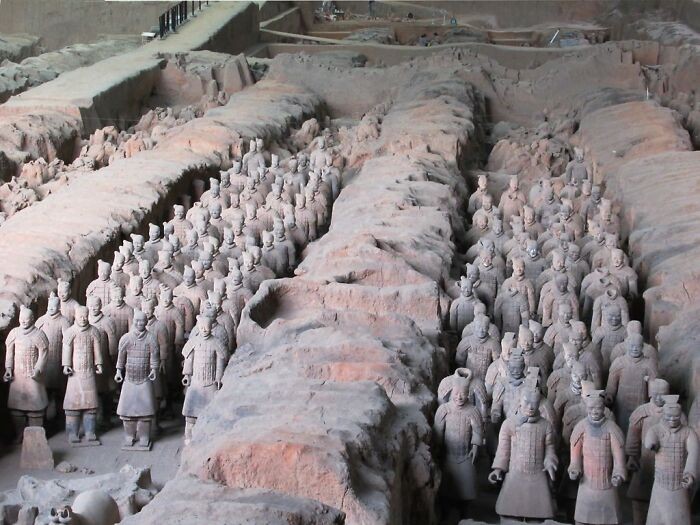 Tentara terakota (246-209 SM): Peninggalan di China yang menakjubkan ini terdiri dari 8.000 patung tentara, pejabat, kuda dan kereta kuda. Terbuat dari tanah liat, ukurannya setara manusia dan realistis, bahkan dulu memegang senjata asli. Meski hanya ada 10 variasi wajah, setiap tentara terlihat unik. Foto: Bored Panda