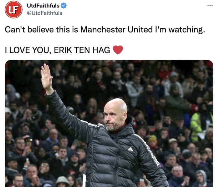 Akun ini menyebut sampai tidak percaya MU menjadi sehebat ini di bawah asuhan Ten Hag. Foto: Twitter