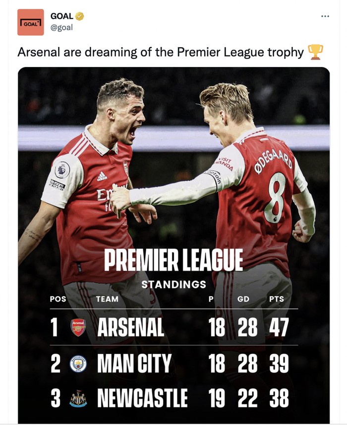 Poin Arsenal pun 14 angka lebih tinggi dari Spurs. Foto: Twitter