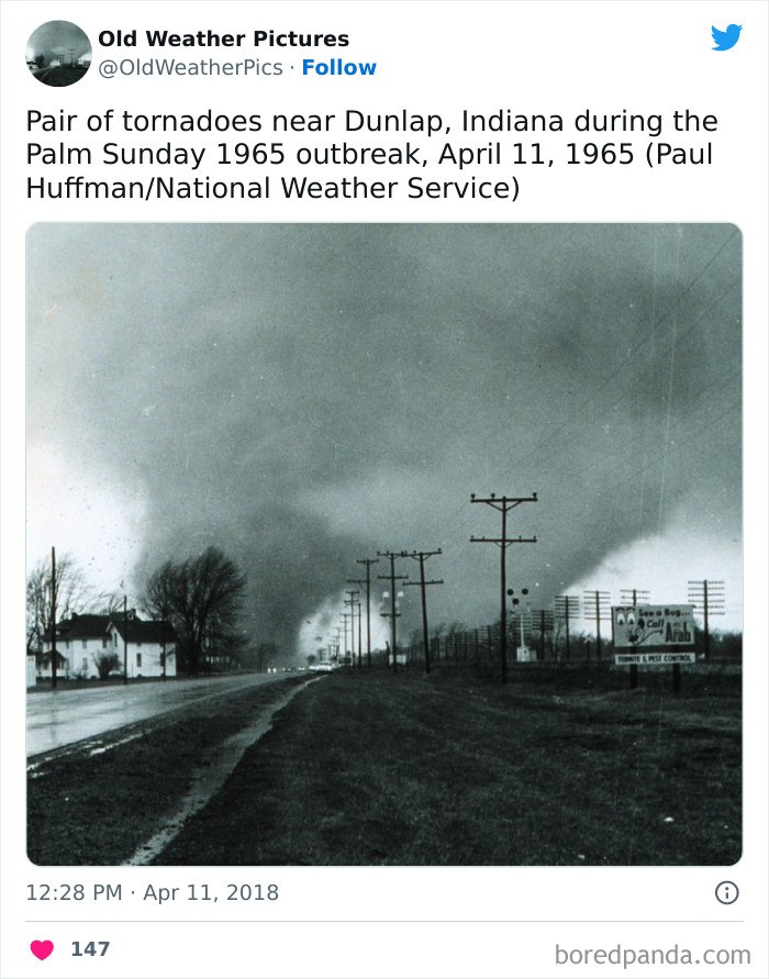 Sepasang tornado dekat Dunlap, Indiana selama wabah Minggu Palem 1965, 11 April 1965Β Foto: Twitter/OldWeatherPics