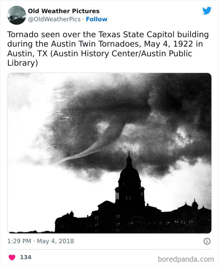 Tornado terlihat di atas gedung Texas State Capitol selama Austin Twin Tornadoes, 4 Mei 1922 di Austin, TXΒ Foto: Twitter/OldWeatherPics