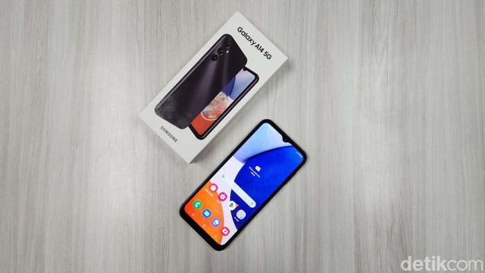 Galaxy A14 5G disokong chipset Dimensity 700. Bila di AS hadir dengan RAM 4 GB, versi Indonesia lebih tinggi, yakni 6 GB. Foto: Adi Fida Rahman/detikINET