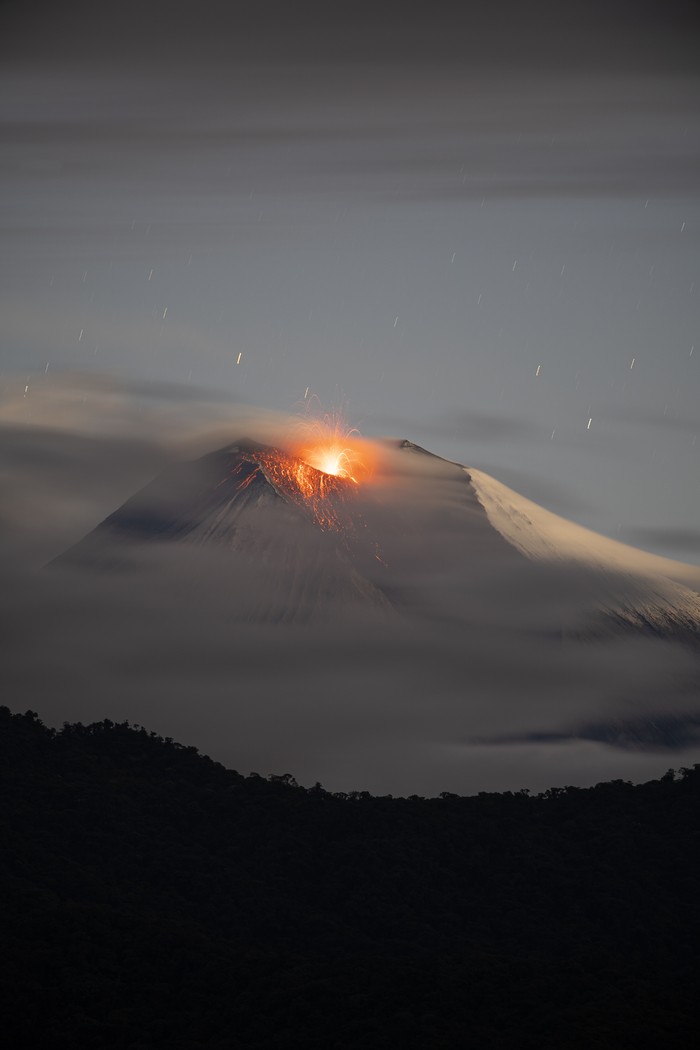 Karya Kevin Moncayo. Gunung Sangay telah aktif selama beberapa tahun terakhir di Ekuador, mengirimkan abu ke kota-kota yang jaraknya ratusan mil. Kevin melakukan perjalanan ke gunung berapi dan menunggu selama 72 jam sebelum dia dapat memotretnya saat fajar dengan awan dan bintang di gambar yang sama.Foto: The World Photography Organisation
