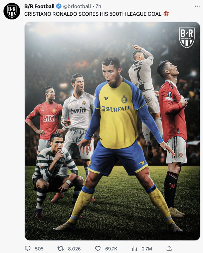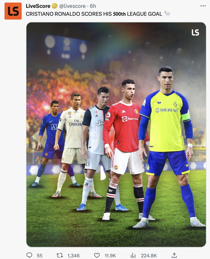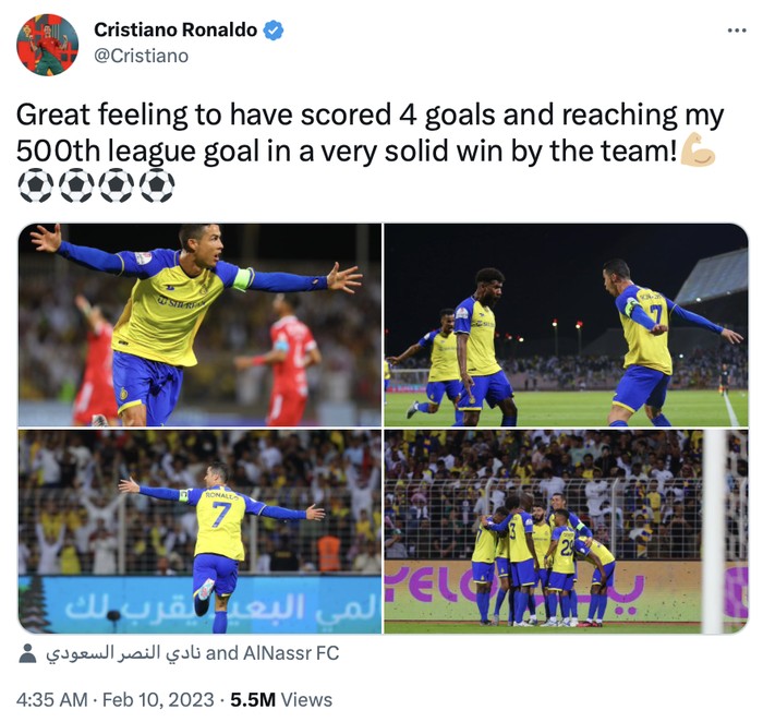 Empat gol ini juga membulatkan pria asal Portugal itu sudah mencetak 500 gol untuk klub yang dibela selama ini. Foto: Twitter