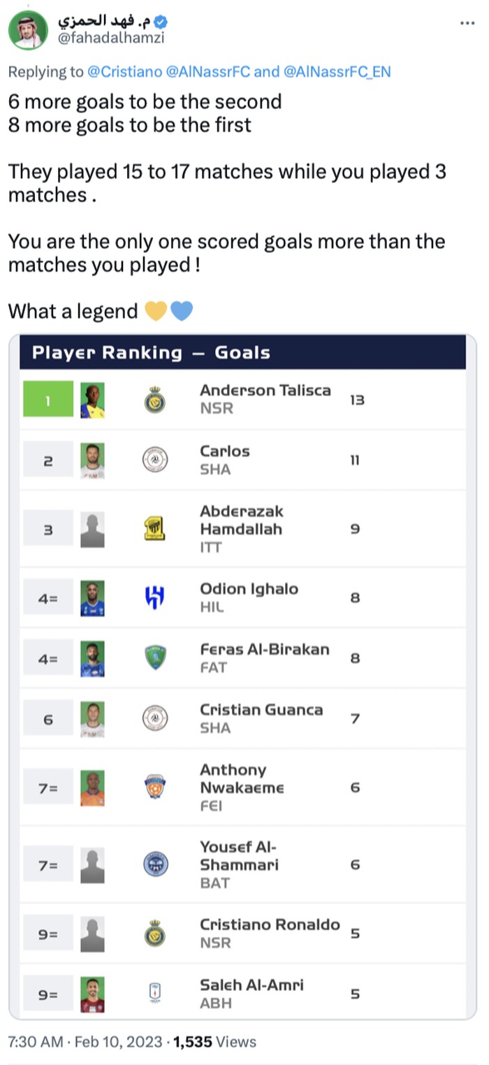 Netizen sampai sesumbar, Ronaldo bisa jadi top skor Liga Arab Saudi andai jika terus gacor. Foto: Twitter