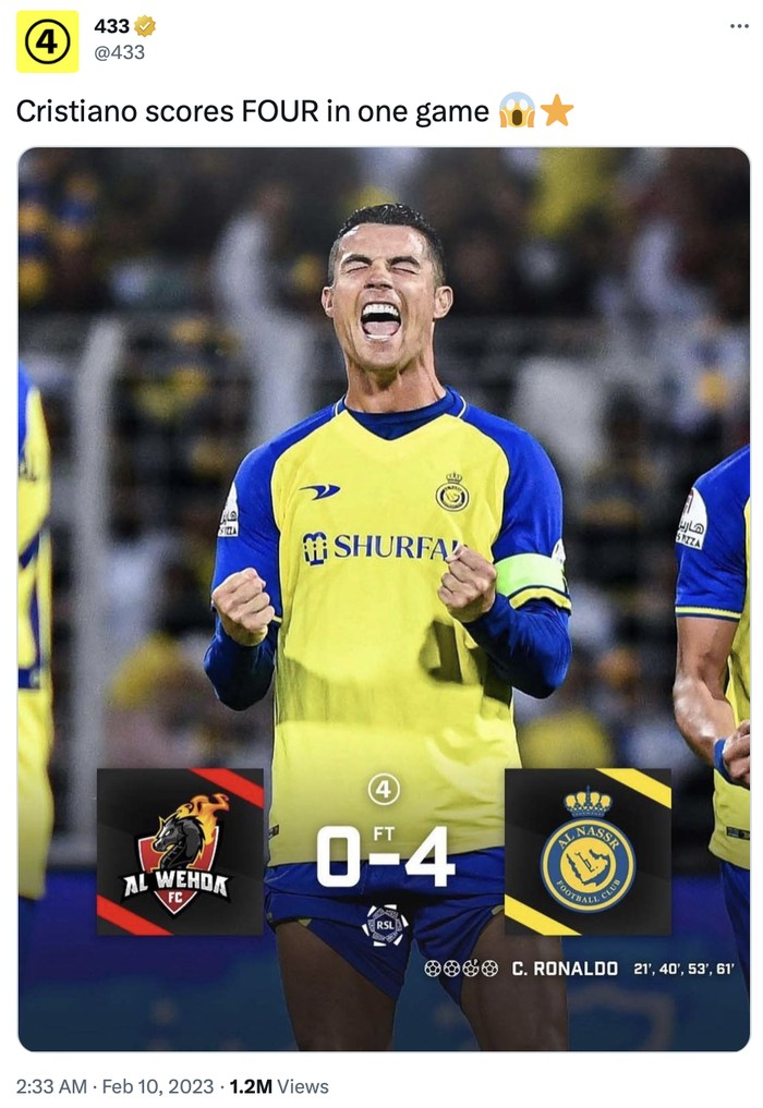 Kabar dari negeri Arab terdengar lantang di dunia maya, saat Cristiano Ronaldo mencetak quattrick ke gawang Al-Wehda dalam lanjutan Liga Arab Saudi. Foto: Twitter
