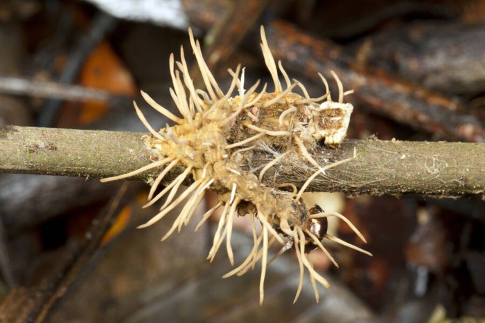 Serangga yang diparasit oleh jamur Cordyceps di hutan hujan Ma Da di Vietnam.Β Foto: Twitter Β
