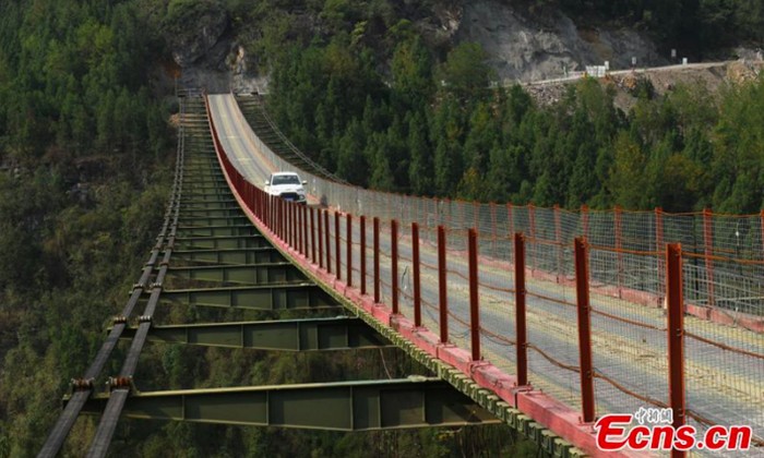 Adapun lebar jembatan adalah 4 meter, dan hanya ditopang oleh konstruksi semacam kabel yang mampu menahan beban sampai 50 ton.Β Foto: ECNS.cn