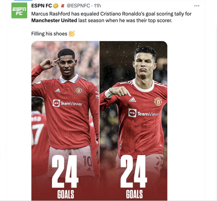 Marcus Rashford membukukan dua gol, membuat golnya musim ini sudah menyamai Cristiano Ronaldo musim lalu. Foto: Twitter
