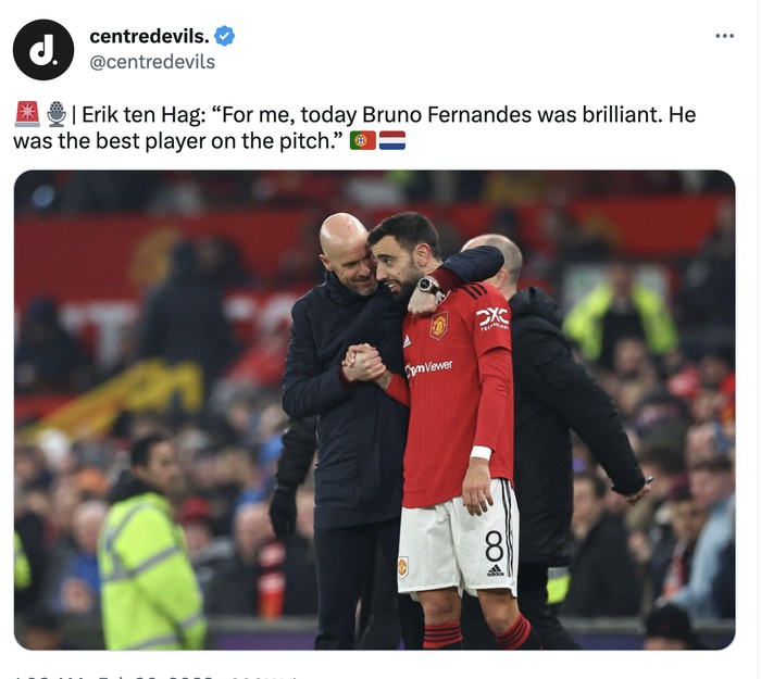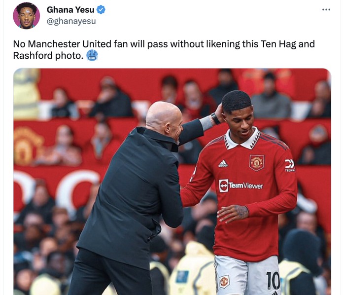 Akun resmi MU di Twitter tanpa ragu memuji pelatih Erik Ten Hag sebagai sosok yang genius. Foto: Twitter