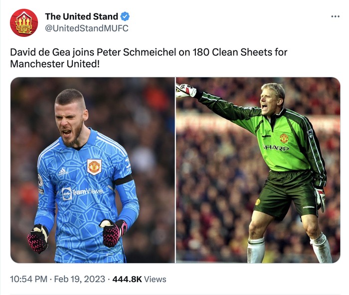 Dengan 180 clean sheet, David De Gea kini setara dengan Peter Schmeichel, kiper andalan MU di masa lalu. Foto: Twitter