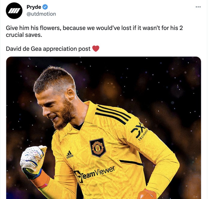 "Berikan bunga pada dia karena kita akan kalah jika dia tidak membuat dua penyelamatan krusial," puji netizen ini pada David De Gea. Foto: Twitter