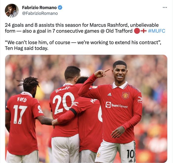 "24 gol dan 8 assist musim ini dari Marcus Rashford, performa yang sukar dipercaya," tulis Fabrizio Romano. Foto: Twitter