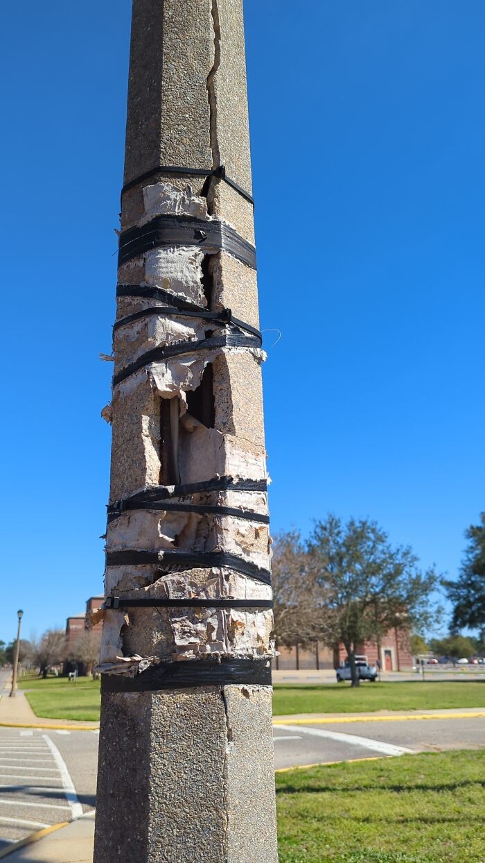 Retakan tiang malah dibalut dengan tali plastik. Foto: Reddit via Boredpanda
