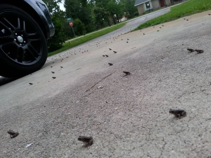 Hujan baru saja selesai. Semuanya heningΒ dan kemudian seseorang fotografer berjalan keluar pintu rumahnya dan mendapaati hal sangat mengejutkan. Katak ada di mana-mana, menutupi tanah. Tapi anehnya, mereka tidak bergerak. Mereka tetap di tanah dengan berjarak sama satu sama lain, anehnya mereka menghadap ke arah yang sama persis. Foto: Travelerz