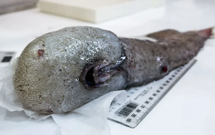 Blobfish ini dikumpulkan dari kedalaman 2,5 kilometer di lepas pantai New South Wales. Ia memiliki daging berair yang lembut dan merupakan predator penyergap yang berbaring diam di dasar, menunggu mangsa yang tidak menaruh curiga lewat. Foto: Themindcircle