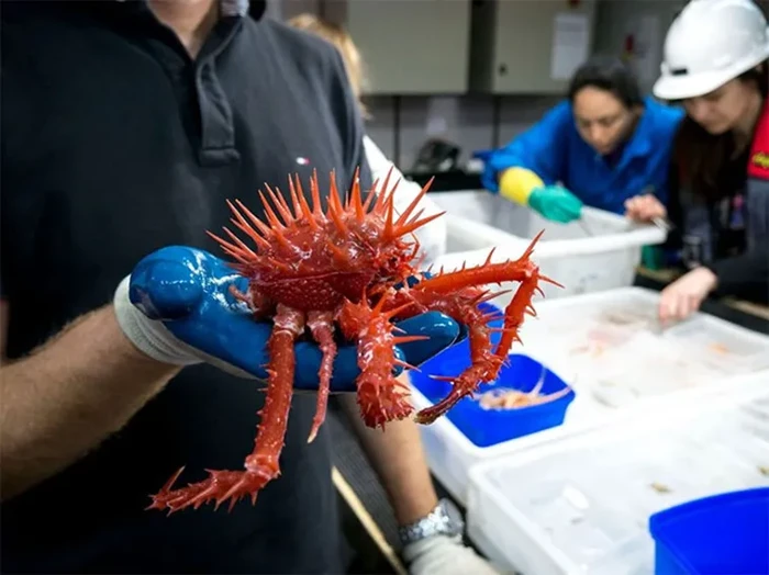 Kepiting berduri merah cerah ini memiliki baju besi berduri yang melindunginya dari bahaya laut dalam. Ini sebenarnya bukan kepiting sejati tetapi lebih terkait dengan kelomang - meskipun pertapa ini telah menukar cangkangnya dengan paku degil. Foto: Themindcircle