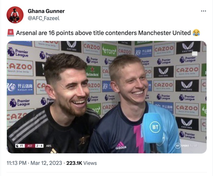 Pemain Arsenal tertawa karena 16 poin unggul dari MU yang disindir sebagai penantang titel. Foto: Twitter