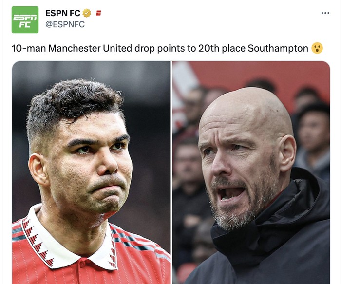 Karena Casemiro dikartu merah, MU harus bermain dengan 10 pemain dan ditahan Southampton yang saat ini ada di juru kunci. Foto: Twitter
