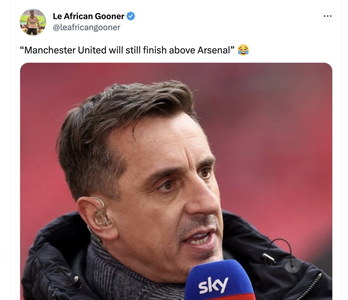 Sindiran untuk Gary Neville yang pernah mengatakan MU akan finish di atas Arsenal. Foto: Twitter