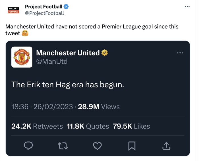 Sejak tweet era Erik Ten Hag sudah dimulai ini, MU belum mencetak gol lagi di Liga Inggris. Foto: Twitter