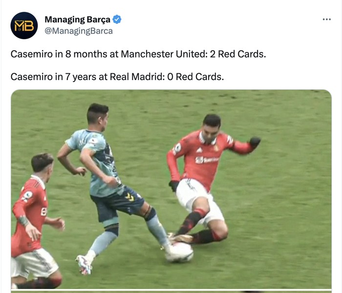 Selama 7 tahun di Real Madrid, Casemiro belum pernah dikartu merah. Tapi baru 8 bulan di MU, dia sudah diganjar dua kartu merah. Foto: Twitter