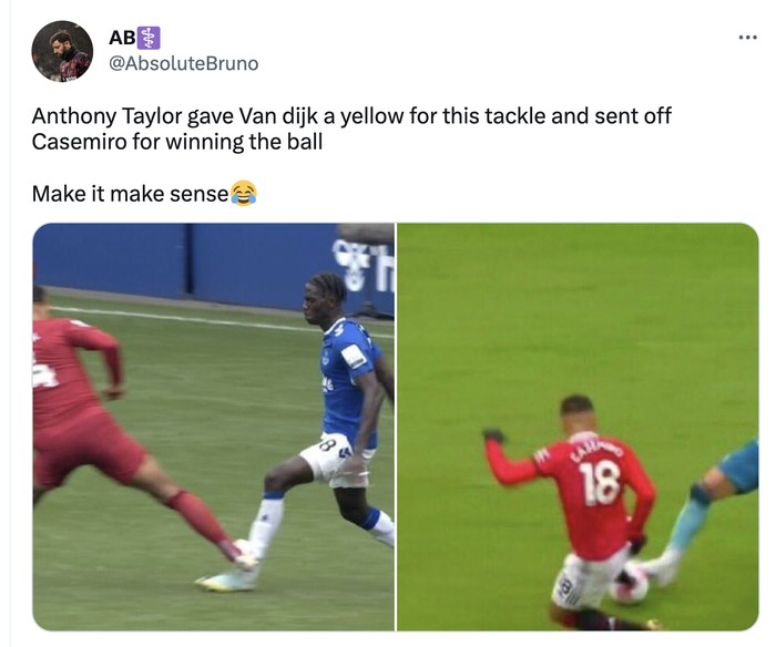 Anthony dinilai tidak adil, pasalnya Van Dijk yang lebih parah pelanggarannya dikartu kuning, sementara Casemiro lebih dulu menyentuh bola dikartu merah. Foto: Twitter