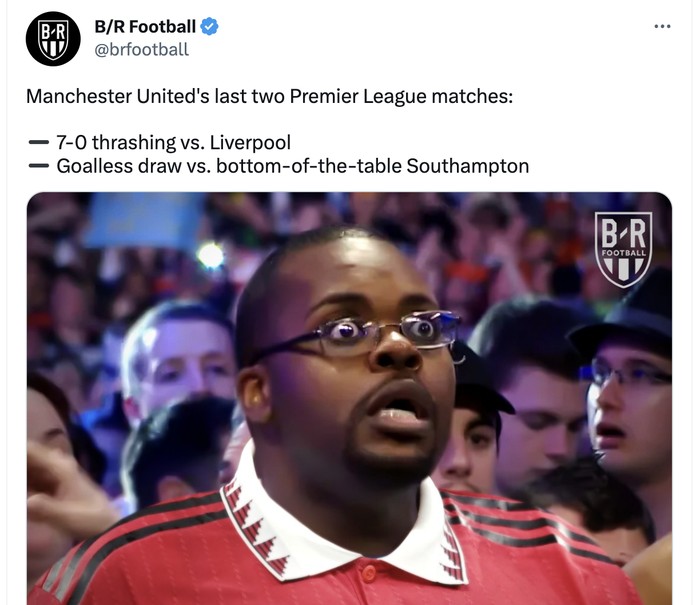 Dalam 2 laga terakhir di Liga Inggris, Manchester United dihancurkan Liverpool dan ditahan juru kunci Southampton. Foto: Twitter