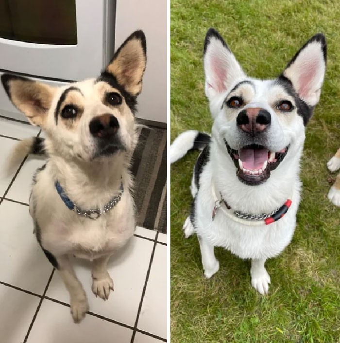 "Transformasi Jess, ia tersesat saat kami menemukannya. Dokter hewan mengatawan bahwa ia memiliki 1 minggu untuk bertahan hidup. Mei 2021 vs. Agustus 2022" Foto: Boredpanda