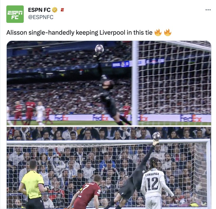 Untung semalam Alisson sedang bagus-bagusnya sehingga Liverpool tak kebobolan lebih banyak gol. Foto: Twitter