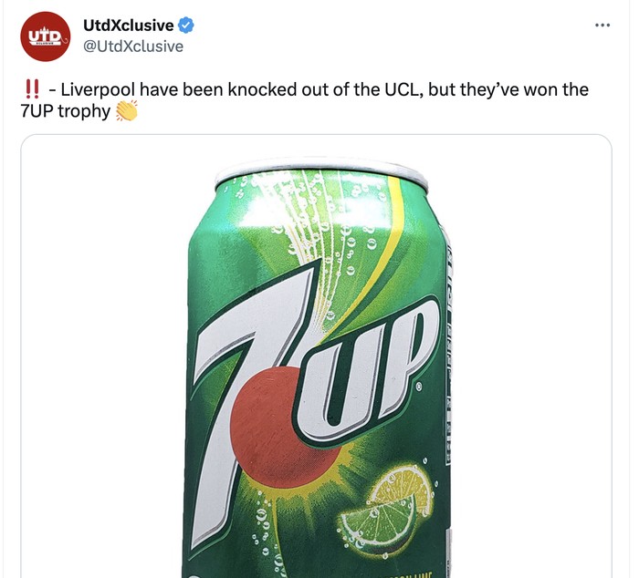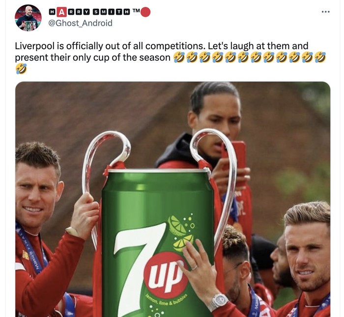 Mari tertawakan Liverpool dengan gelar 7Up yang mereka raih. Foto: Twitter