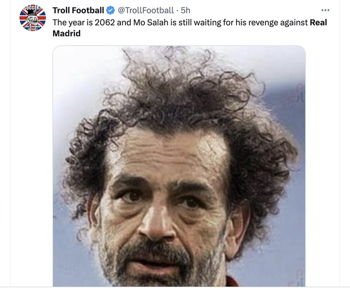 Bahkan di tahun 2062 pun, Mos Salah tetap tidak bisa membalaskan dendam Liverpool atas Real Madrid. Foto: Twitter