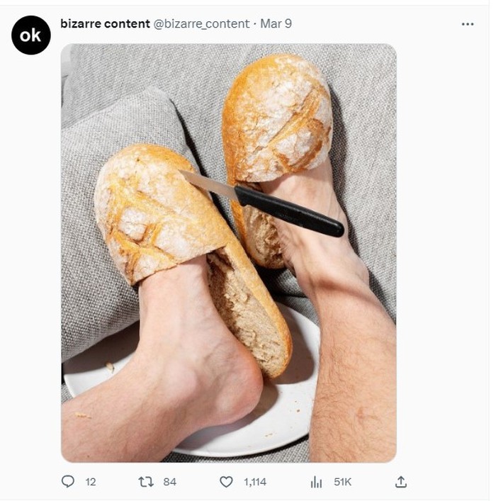 Sandal para sultan menggunakan roti. Foto: Twitter/Bizarre_Content