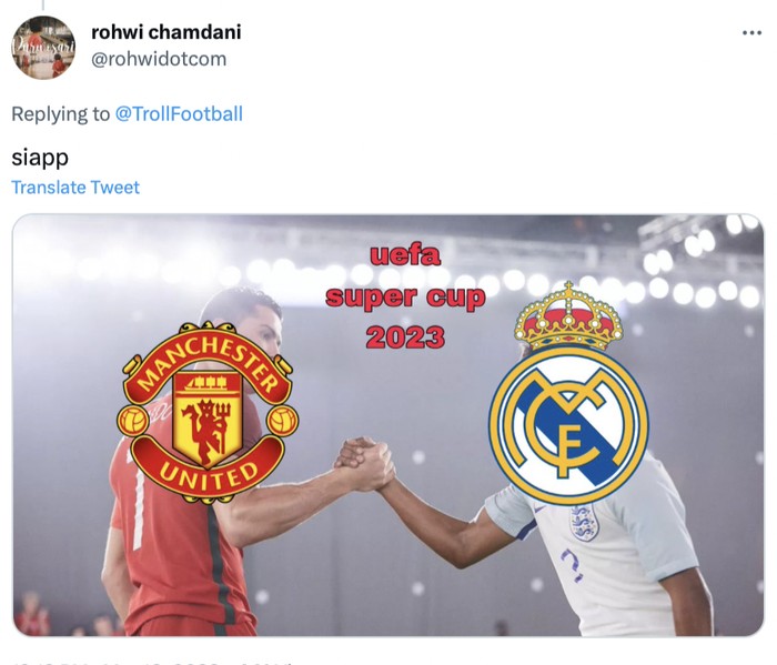 Andaikan Real Madrid juara Liga Champions dan MU menjuarai Liga Europa, maka kedunya akan berhadapan di UEFA Super Cup 2023. Gimana detikers? Foto: Twitter