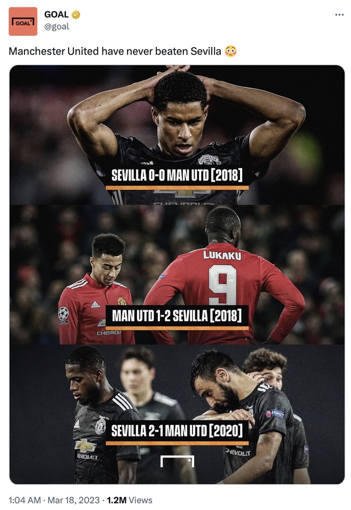 Setan Merah pun rekor buruk kalau melawan Sevilla. Foto: Twitter