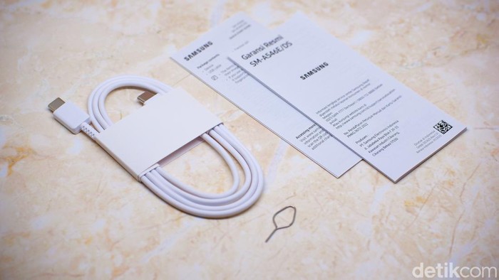 Selain unit Galaxy A54 5G, di dalam kotak kemasa terdapat kabel data USB Type C, SIM Card Injector, buku pentunjuk dan kartu garansi.Foto: Adi Fida Rahman/detikINET