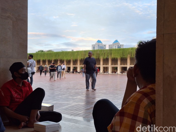 Duduk-duduk santai di pelataran masjid bisa menjadi alternatif sembari melihat keindahan bangunan Masjid Istiqlal dan aktivitas yang dilakukan pengunjung. Foto: Adi Fida Rahman/detikINET