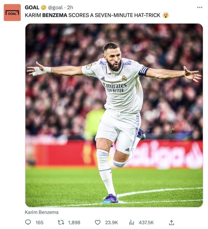 Karim Benzema tampil impresif dengan mencetak hattrick hanya dalam waktu tujuh menit. Foto: Twitter