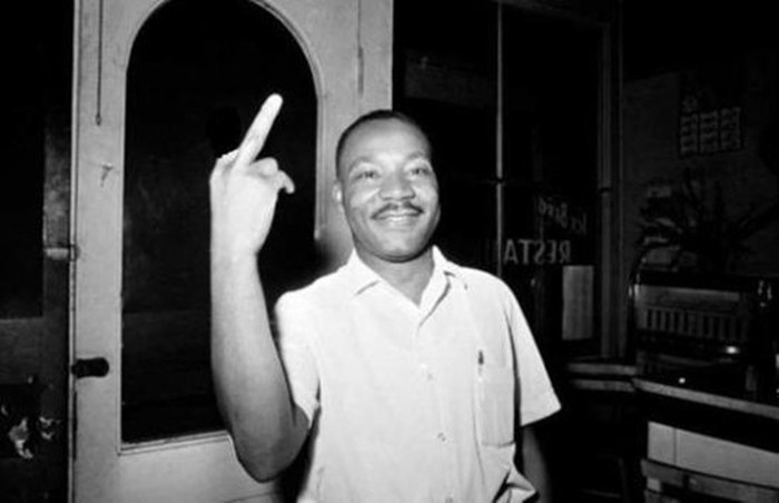 Ini mungkin terlihat seperti Martin Luther King Jr. mengacungkan jari tengah, tetapi ini telah diedit. Sslinya dia memberikan tanda perdamaian. Foto: Reddit