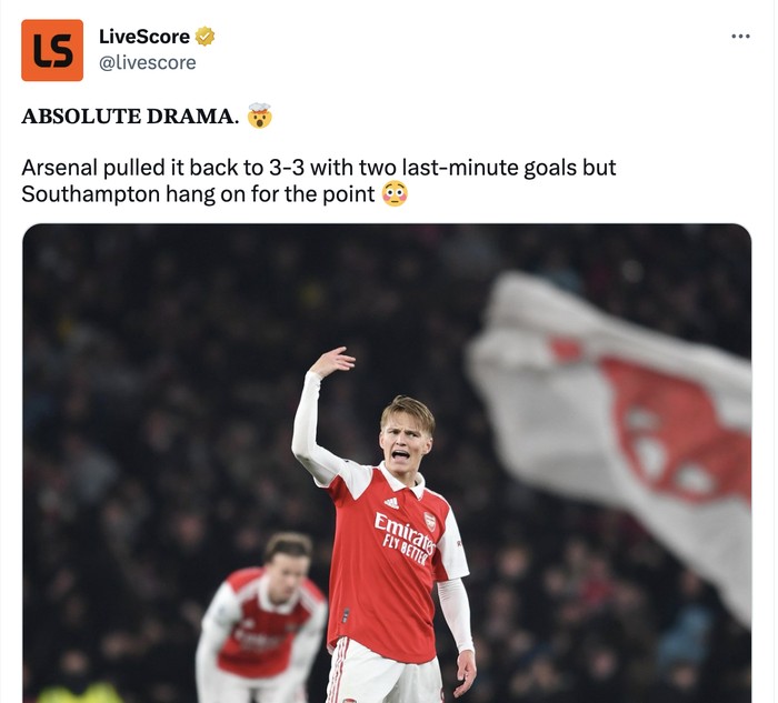 Sungguh sebuah drama, Arsenal berhasil menyamakan kedudukan di menit akhir lawan Southampton dan hasilnya imbang 3-3. Foto: Twitter