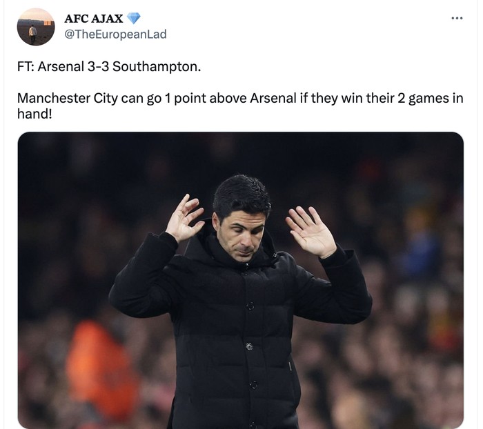 Arteta tentu cemas karena City berpotensi menyalip mereka. Foto: Twitter