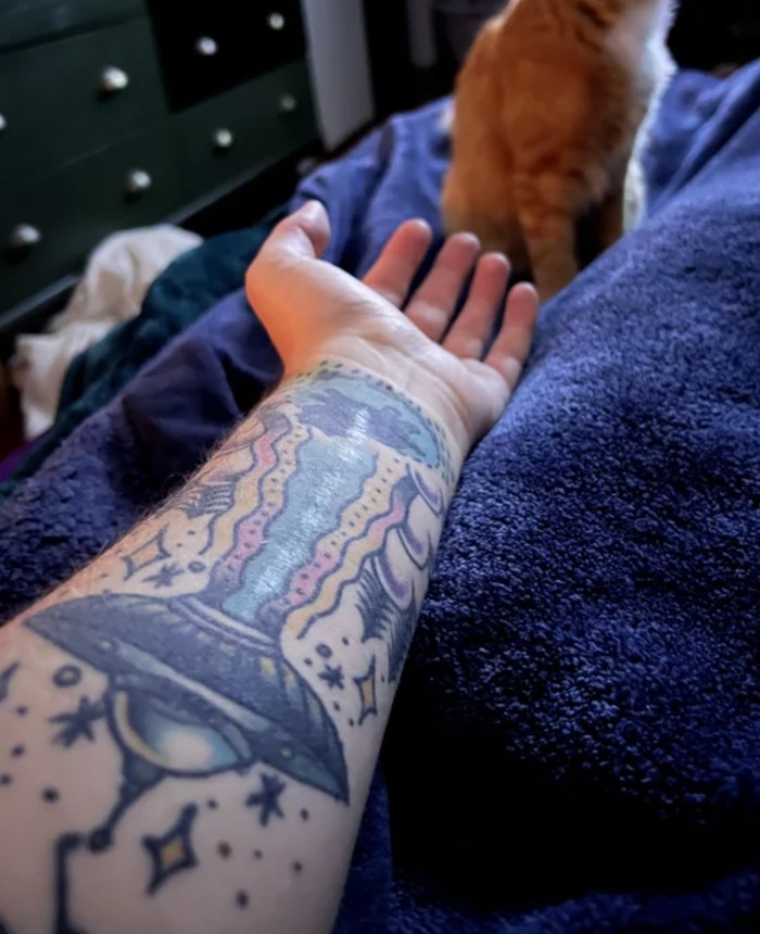 βTahun lalu, pergelangan tangan saya diganti. Mengubah bekas luka menjadi rangkaian pohon pinus, menambahkan latar belakang langit malam di sesi berikutnya.β Foto: Brightside