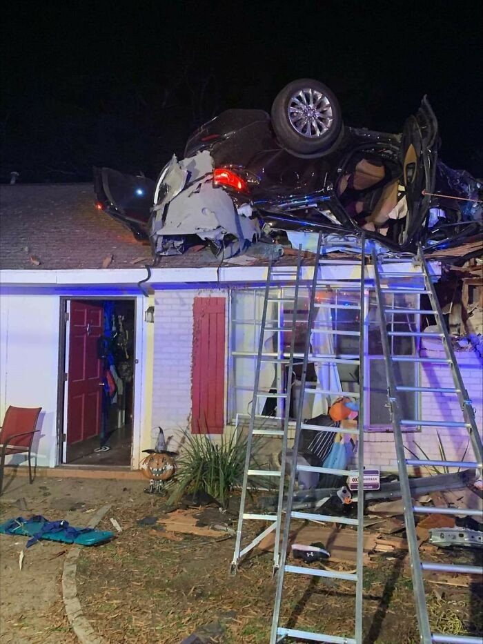 Bagaimana bisa mobil sampai nyangkut di atap rumah? Foto: Bored Panda
