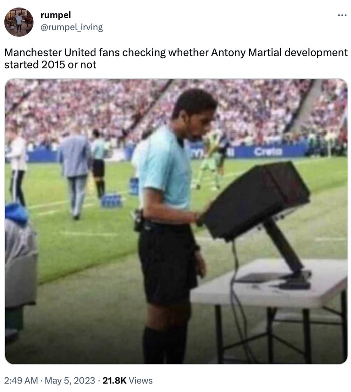 Antony Martial yang menghilang tadi malam, meme wasit cari keberadaan pria Prancis tersebut. Foto: Twitter