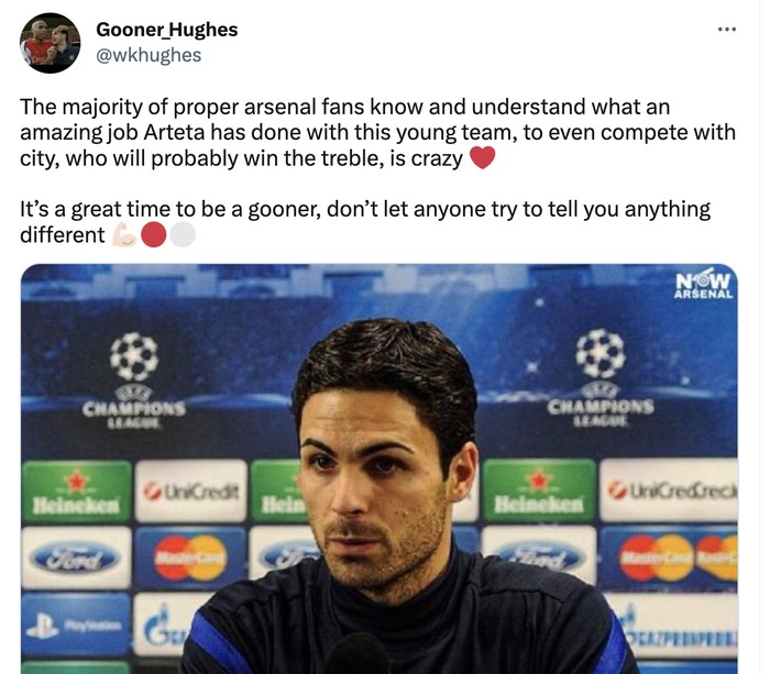 Menurut netizen ini, mayoritas pendukung Arsenal menilai Arteta telah melakukan pekerjaan hebat dengan menyaingi City. "Ini adalah waktu yang hebat menjadi fans Arsenal dan jangan biarkan siapapun mengatakan yang berbeda," tulisnya. Foto: Twitter